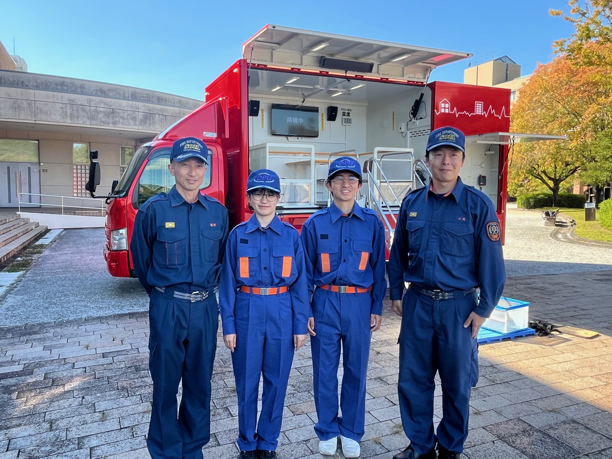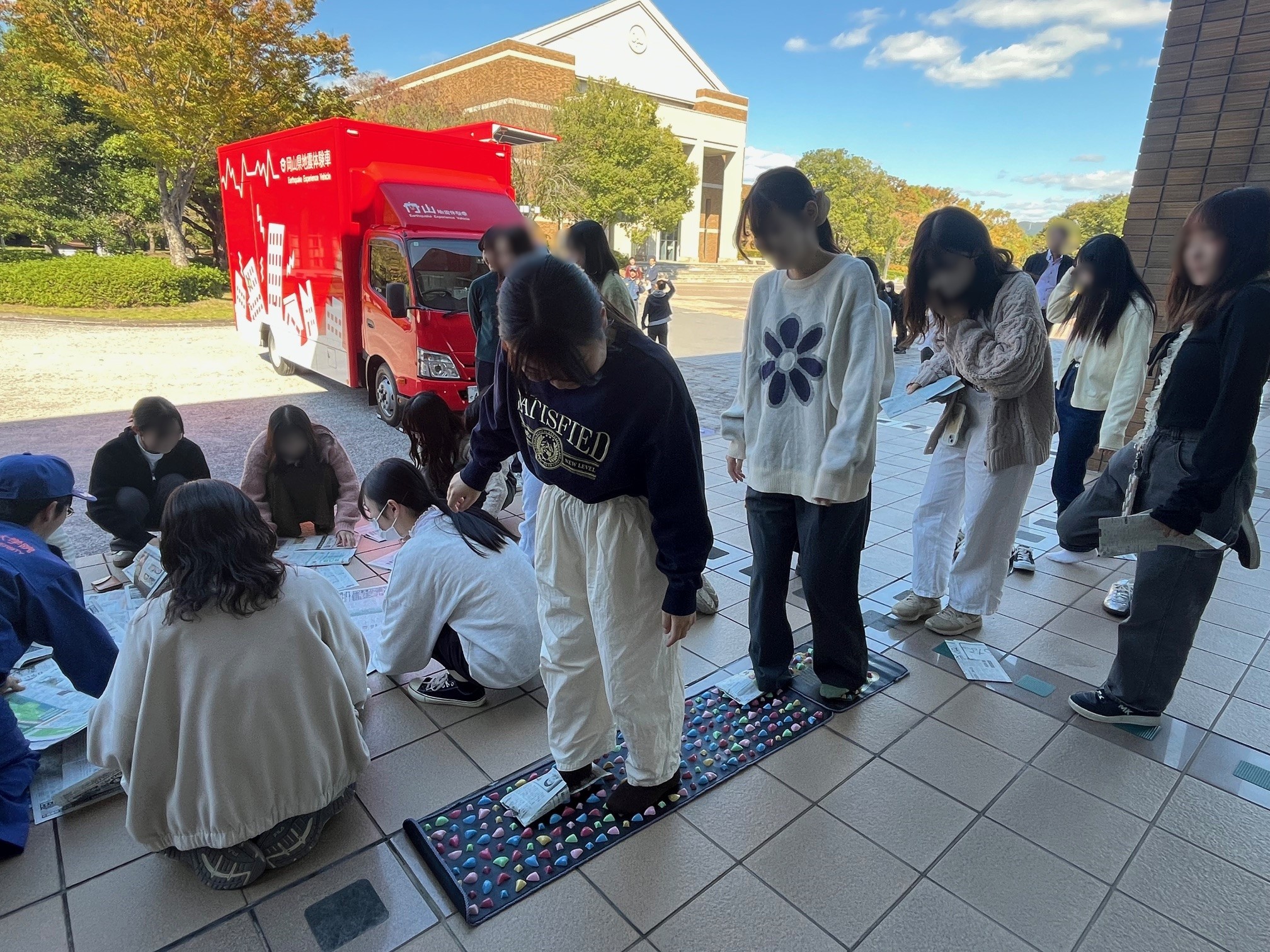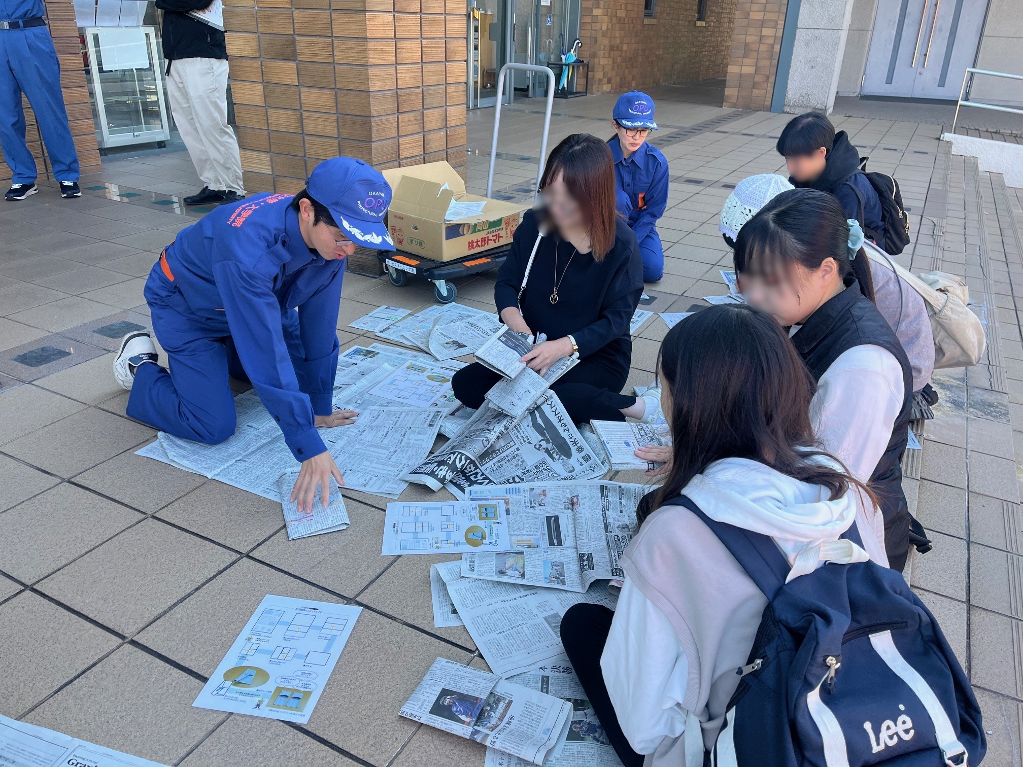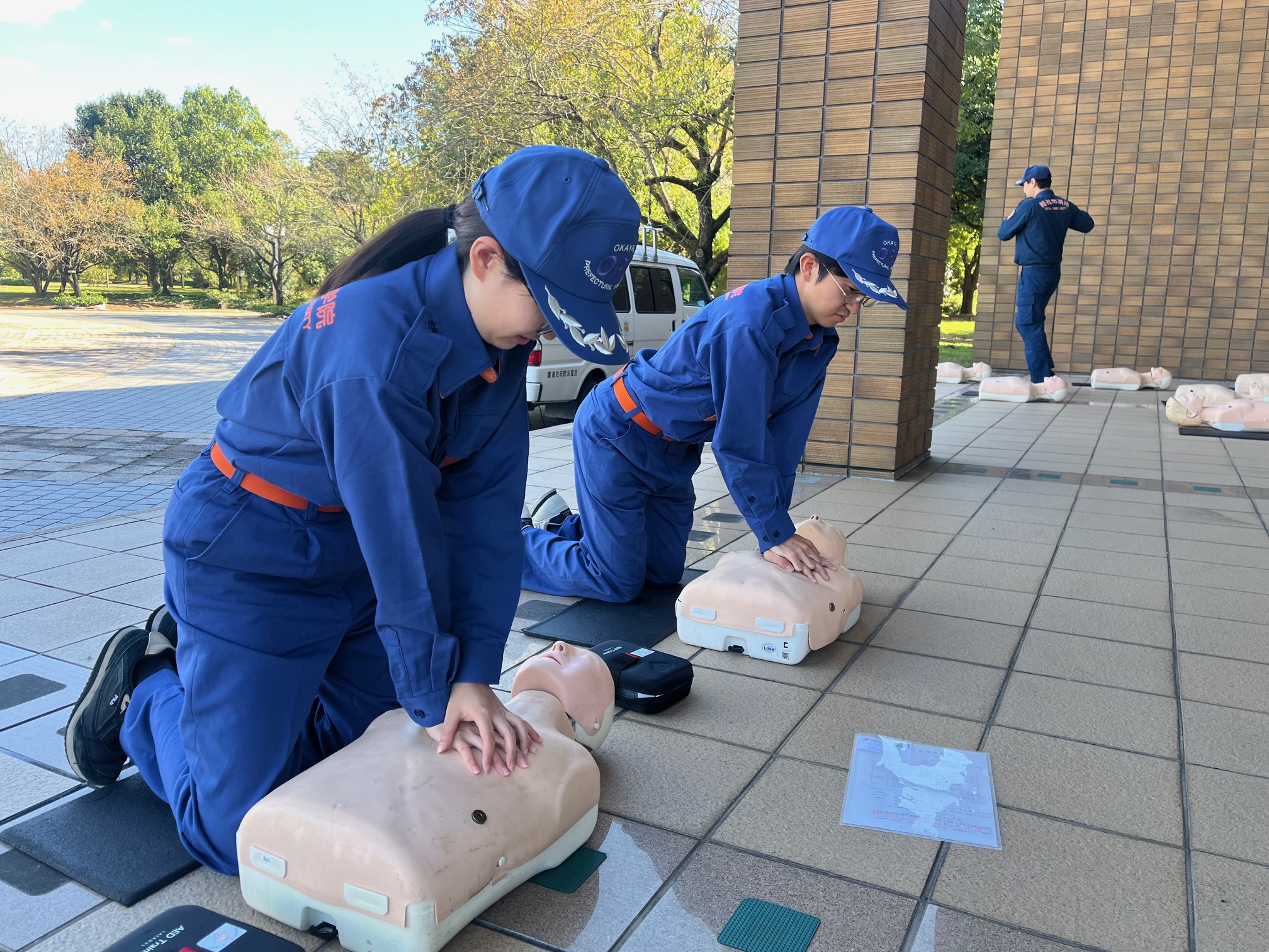 10月29日、OPU消防応援隊2名が学内防火・防災訓練に参加しました。当日は教職員や学生に向けて、地震体験車での地震体験やAEDを使用した応急救護技術向上のための訓練が行われました。昨年に引き続き、OPU消防応援隊は、新聞紙スリッパ作成と歩行体験コーナーを担当し、多くの方々に参加していただくことができました。総社市消防局の方々との交流もでき、貴重な機会となりました。